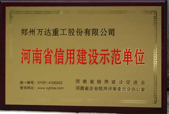 熱烈祝賀鄭州萬達重工股份有限公司通過了“河南省信用建設(shè)促進會”和“河南省企業(yè)信用評審委員會辦公室”共同組織的“河南省信用建設(shè)示范單位”復審認證,被認定為“河南省信用建設(shè)示范單位”榮譽稱號!