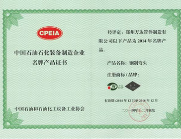 2016/01/28 439 公司益工牌鋼制彎頭被評(píng)為2014年中國石油石化裝備制造企業(yè)名牌產(chǎn)品。
