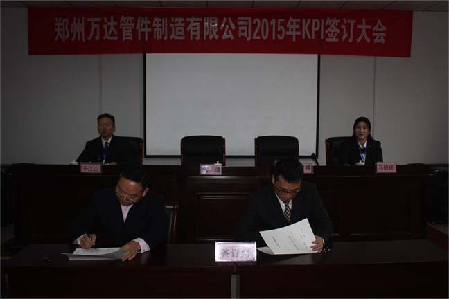 鄭州萬(wàn)達(dá)管件制造有限公司2015年KPI簽訂會(huì)于1月30號(hào)在公司行政區(qū)會(huì)議室隆重舉行,公司班長(zhǎng)以上所有管理人員參加了此次簽訂會(huì)議。簽訂會(huì)分為三級(jí)簽訂,即:董事長(zhǎng)與總經(jīng)理簽訂、總經(jīng)理與公司各高管簽訂、公司各高管與分管的各部門負(fù)責(zé)人簽訂,近期,各部門負(fù)責(zé)人將部門的KPI指標(biāo)進(jìn)行分解,與各班組及相關(guān)崗位簽訂目標(biāo)責(zé)任書,達(dá)到“千斤重?fù)?dān)人人挑,人人肩上有指標(biāo)”的責(zé)任分解領(lǐng)受,確保最終順利完成公司2015年度各項(xiàng)任務(wù)和目標(biāo)。